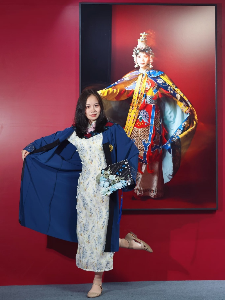 江宇梁的戏曲形象出现在北京大学建校125周年纪念活动“青春北大”人像摄影展上,图为江宇梁穿硕士学位服与自己合影