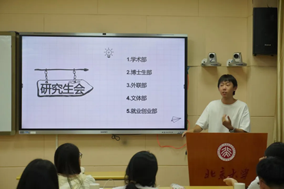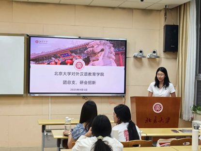 9月5日下午,北京大学对外汉语教育学院2025级团总支、研会招新会于方李邦琴楼109教室举行。2024级硕士研究生叶婧瀛、张祖政和2024级博士研究生丁俊峰分别向新生介绍学院团总支和研究生会各部门的职责分配、工作内容和工作亮点,并展示由团总支、研会所组织的语伴大会、就业分享会、博士生论坛、寒假社会实践等学院品牌活动,鼓励新生积极参与学院工作,锻炼个人能力。