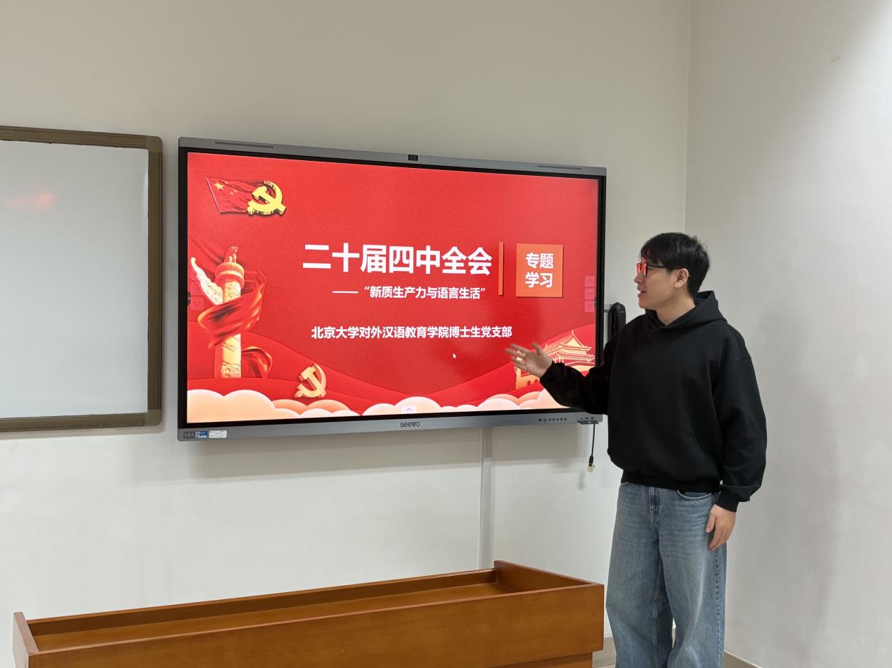 2025年10月24日下午,为深入学习贯彻党的二十届四中全会精神,北京大学对外汉语教育学院各年级党支部积极响应号召,分别组织专题学习与研讨,领会全会精神的核心要义与实践要求。
