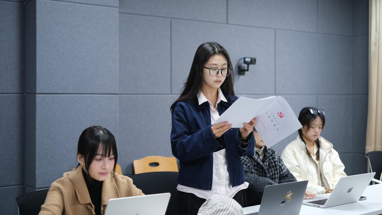 入党积极分子刘昱含领学《中国共产党第二十届中央委员会第四次全体会议公报》,带领大家回顾党的二十届三中全会以来的主要成就,解读“十五五”时期的发展环境、目标与原则。与会成员围绕“文化强国”主题展开深入讨论,立足国际中文教育学科特色,从自身学习与实践出发,探讨在新时代国际交流中坚定文化自信、实事求是、维护国家尊严的重要意义。
