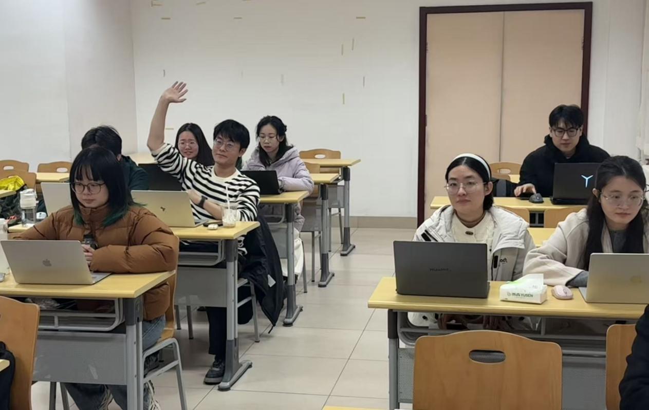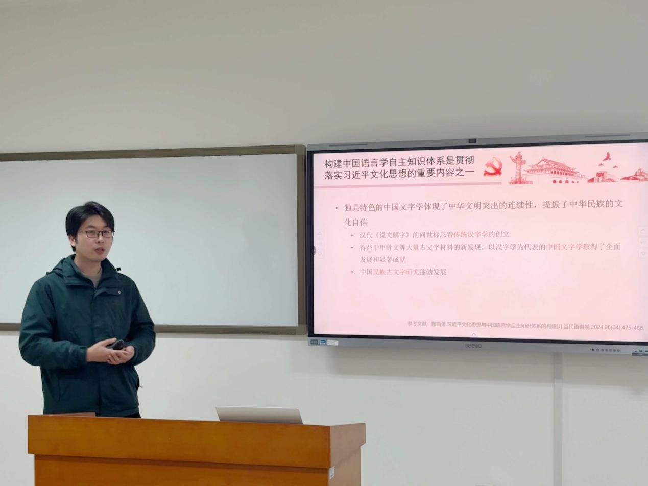 两位党员代表作专题领学。宾帅以“语言生活与新质生产力”为题进行领学。他从二十届四中全会强调的“新质生产力”的核心内涵与发展出发,结合语言学专业背景,通过实际案例分析了人工智能时代语言领域涌现的新现象;陆熠以“贯彻习近平文化思想——积极参与构建中国语言学自主知识体系”为题进行领学。他系统回顾中国语言学学科发展历程,阐释了习近平文化思想为构建中国语言学自主知识体系提供的方法论与目标指引。与会成员围绕如何将四中全会精神融入科研创新与专业实践展开讨论,表示要在学术研究中服务国家战略,贡献青年智慧。